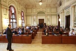 Nowy Ratusz. Spotkanie prezydenta Gdańska Pawła Adamowicza z uczniami gdańskich szkół w ramach XII sesji Młodzieżowej Rady Miasta Gdańska.