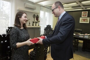 Urząd Miejski w Gdańsku. Spotkanie Prezydenta Gdańska Pawła Adamowicza z Gabrielle Karpinski, najlepszą zagraniczną studentką Gdańskiego Uniwersytetu Medycznego