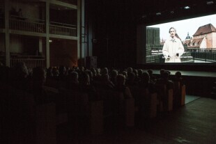 Gdańsk Teatr Szekspirowski. Prezentacja impresji filmowej z otwarcia Gdańskiego Teatru Szekspirowskiego „Zwięzła Kronika Czasu” w reżyserii Andrzeja Wajdy