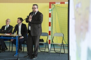 Spotkanie konsultacyjne z mieszkańcami dotyczące rozbudowy układu transportowego Gdańska Południe w latach 2014-2020. Gdańsk Ujeścisko, Szkoła Podstawowa nr 12