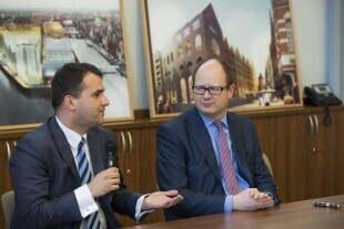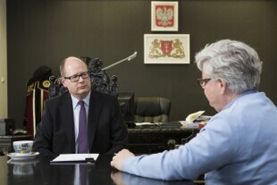 Urząd Miejski w Gdańsku. Kierownik biura The New York Times w Warszawie Rick Lyman przeprowadza wywiad z Prezydentem Gdańska Pawłem Adamowiczem