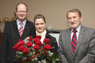 Natalia Partyka, złota medalistka w tenisie stołowym na Paraolimpiadzie w Pekinie, u Prezydenta Gdańska, z rąk którego otrzymała nagrodę pieniężną za osiągnięcia sportowe