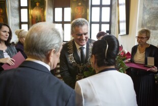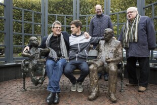 Gdańsk Wrzeszcz, pl. Wybickiego. Odsłonięcie figury Güntera Grassa, która została posadowiona na ławeczce obok podobnej figury bohatera powieści „Blaszanego Bębenka” Oskara Matzeratha. Nz. od lewej: Prezydent Gdańska Paweł Adamowicz, syn Güntera Grass Franz Grass, wnuk Güntera Grass Elia, autor figury prof. Sławoj Ostrowski