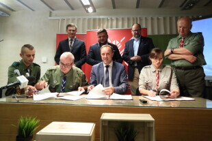 Gdańsk, Nowy Ratusz. Spotkanie z młodzieżą polonijną z Grodna. W spotkaniu udział wzięli, Prezydent Gdańska Paweł Adamowicz i Bogdan Oleszek-Przewodniczący Rady Miasta