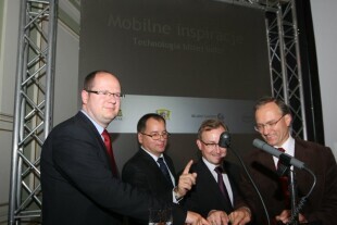 Uruchomienie w Gdańsku systemu Wi-MAX, który jest nowoczesną platformą dostępu do Internetu poprzez nadajniki radiowe. Nz. od lewej: Prezydent Gdańska Paweł Adamowicz, Prezes Intel w Polsce Leszek Pankiewicz, Dyrektor Dep. Handlowego, Przemysł i Sektor Publiczny Alcatel-Lucent Sławomir Palczewski, Prorektor ds. badań naukowych i wdrożeń prof. dr hab. inż. Jan Hupka