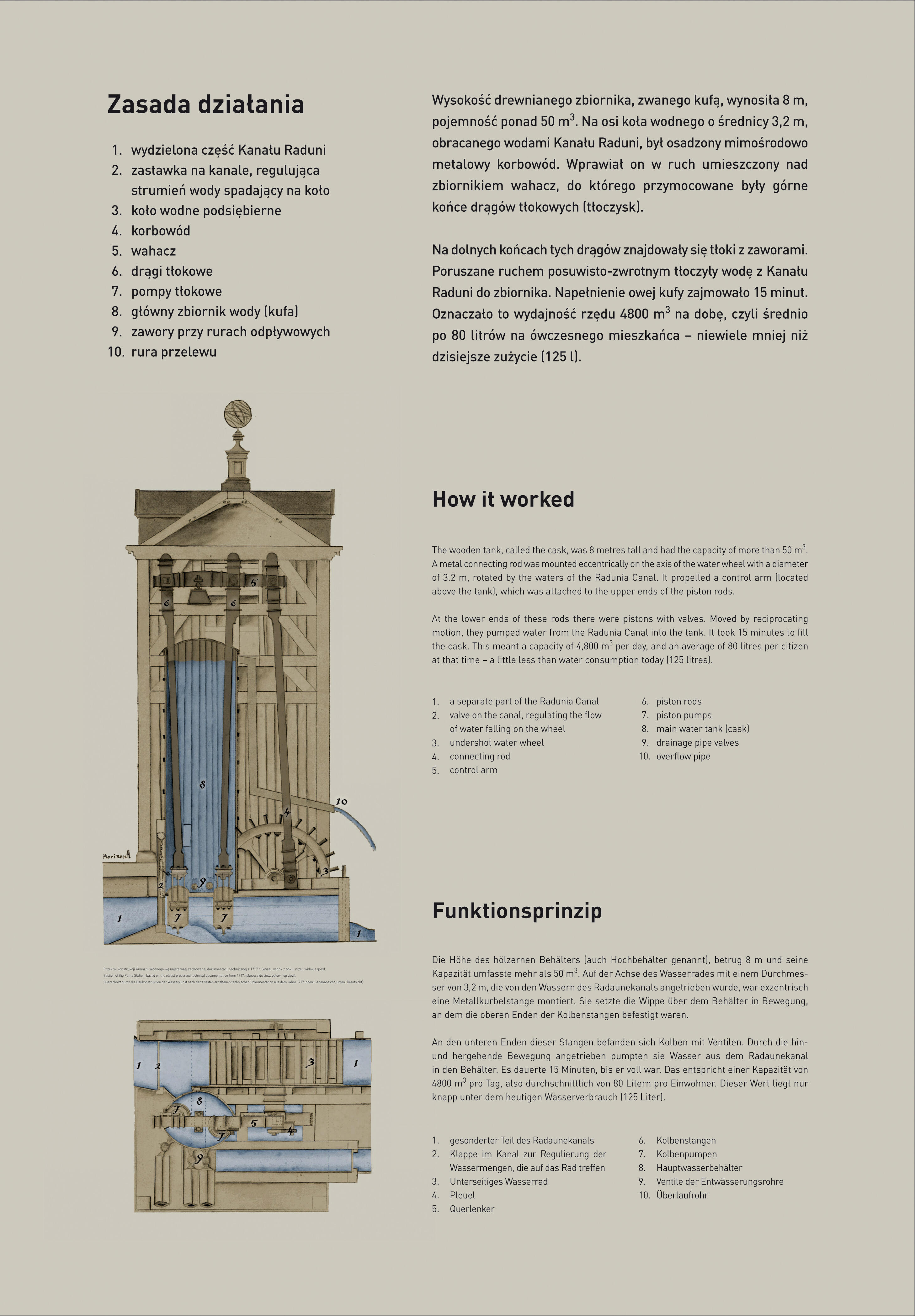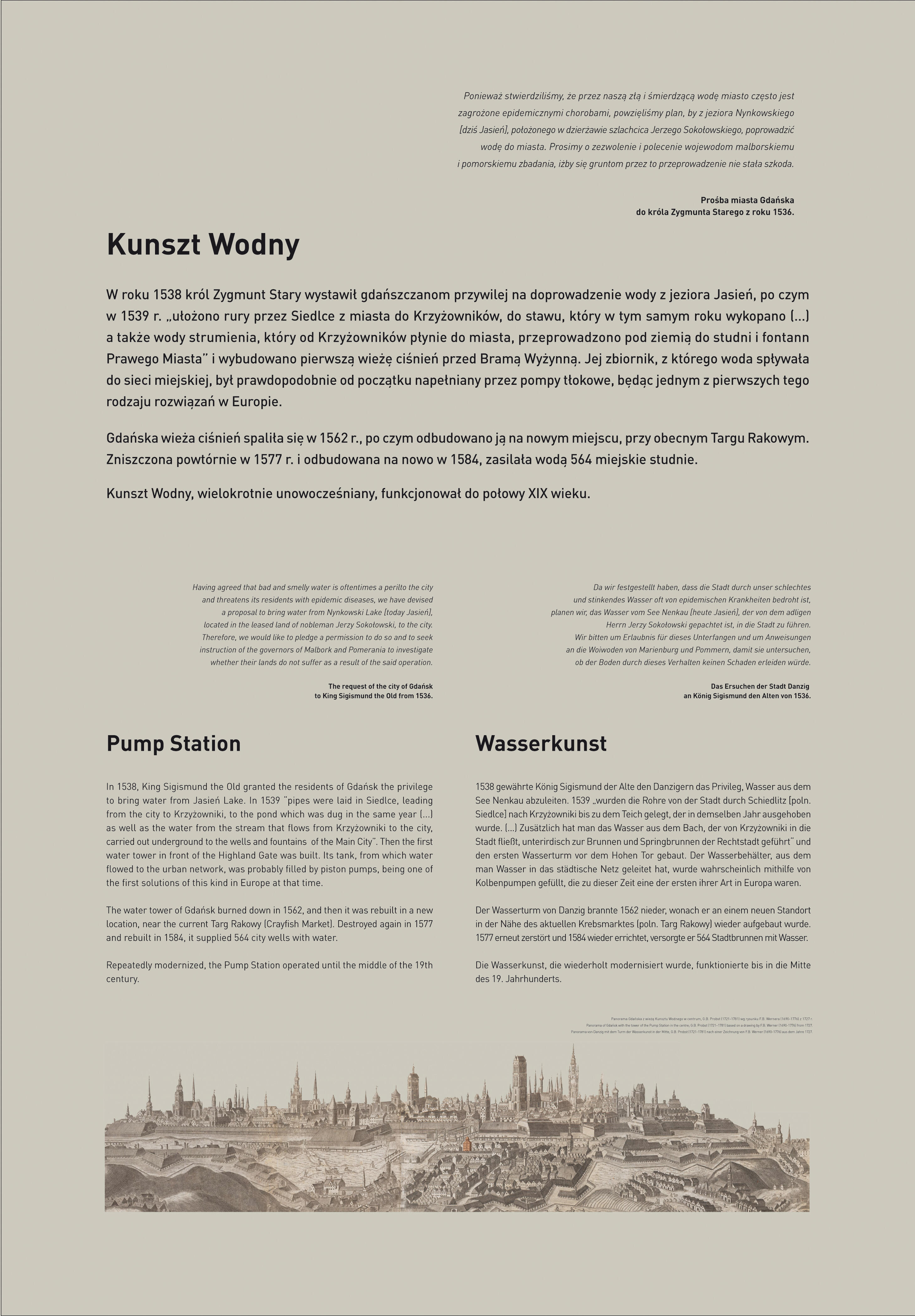 Znajduje się w rogu sali i pokazuje schemat funkcjonowania Kunsztu Wodnego (Wasserkunst), jak nazywano w dawnych wiekach gdańską stację pomp zasilającą miejską sieć wodociągową. Jej sięgającą roku 1536 historię oraz zasadę działania przedstawiają znajdujące się obok modelu tablice informacyjne.