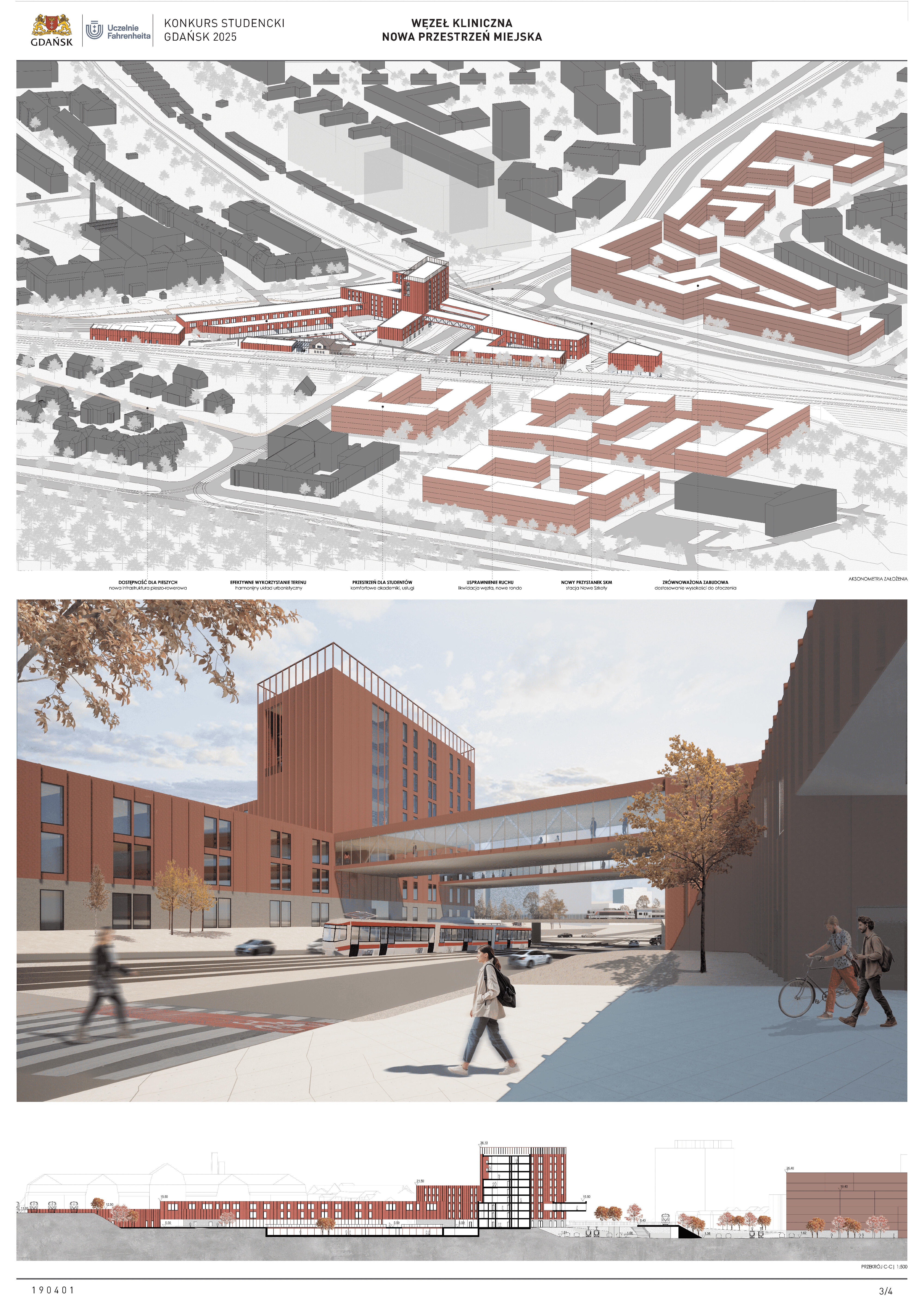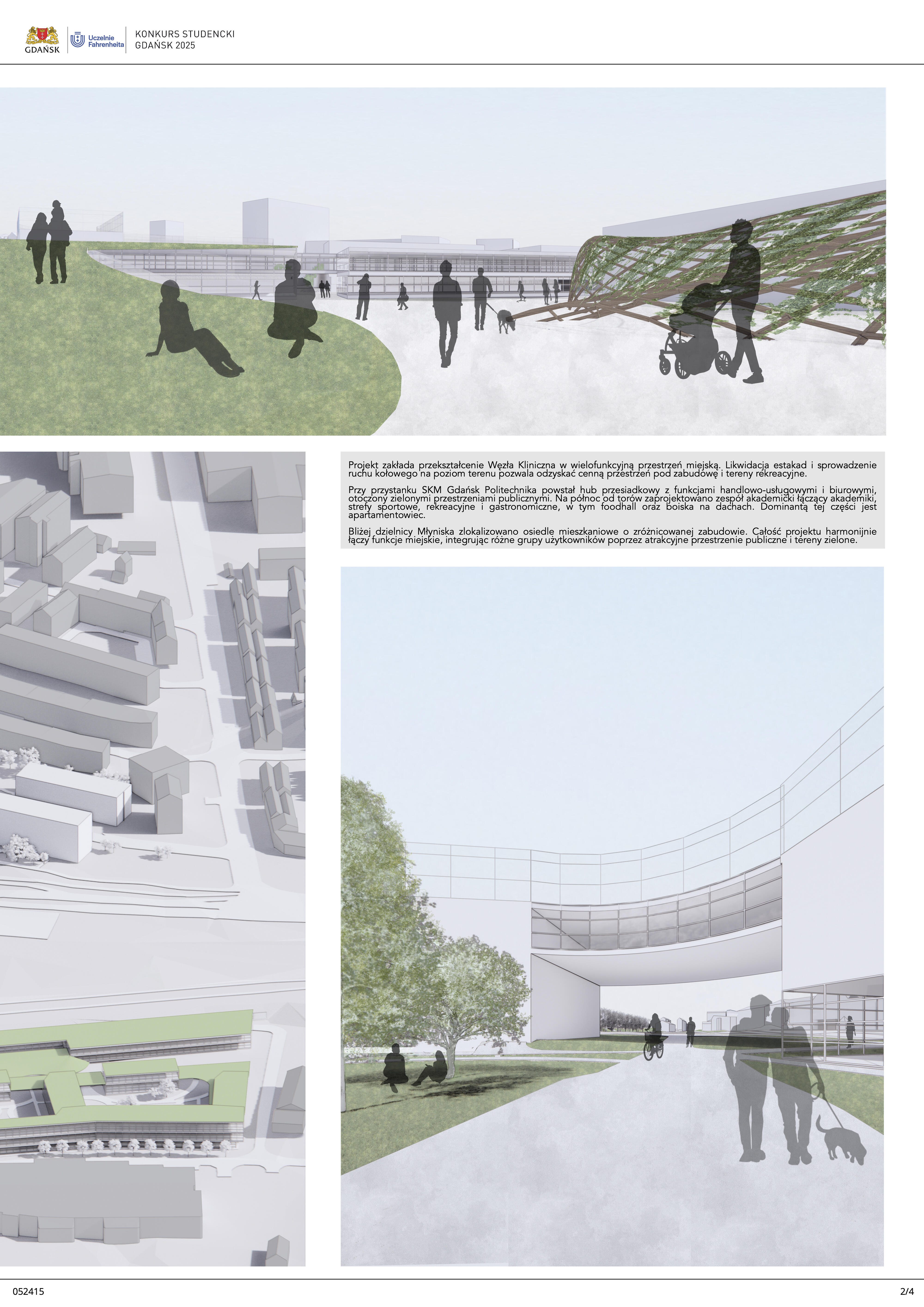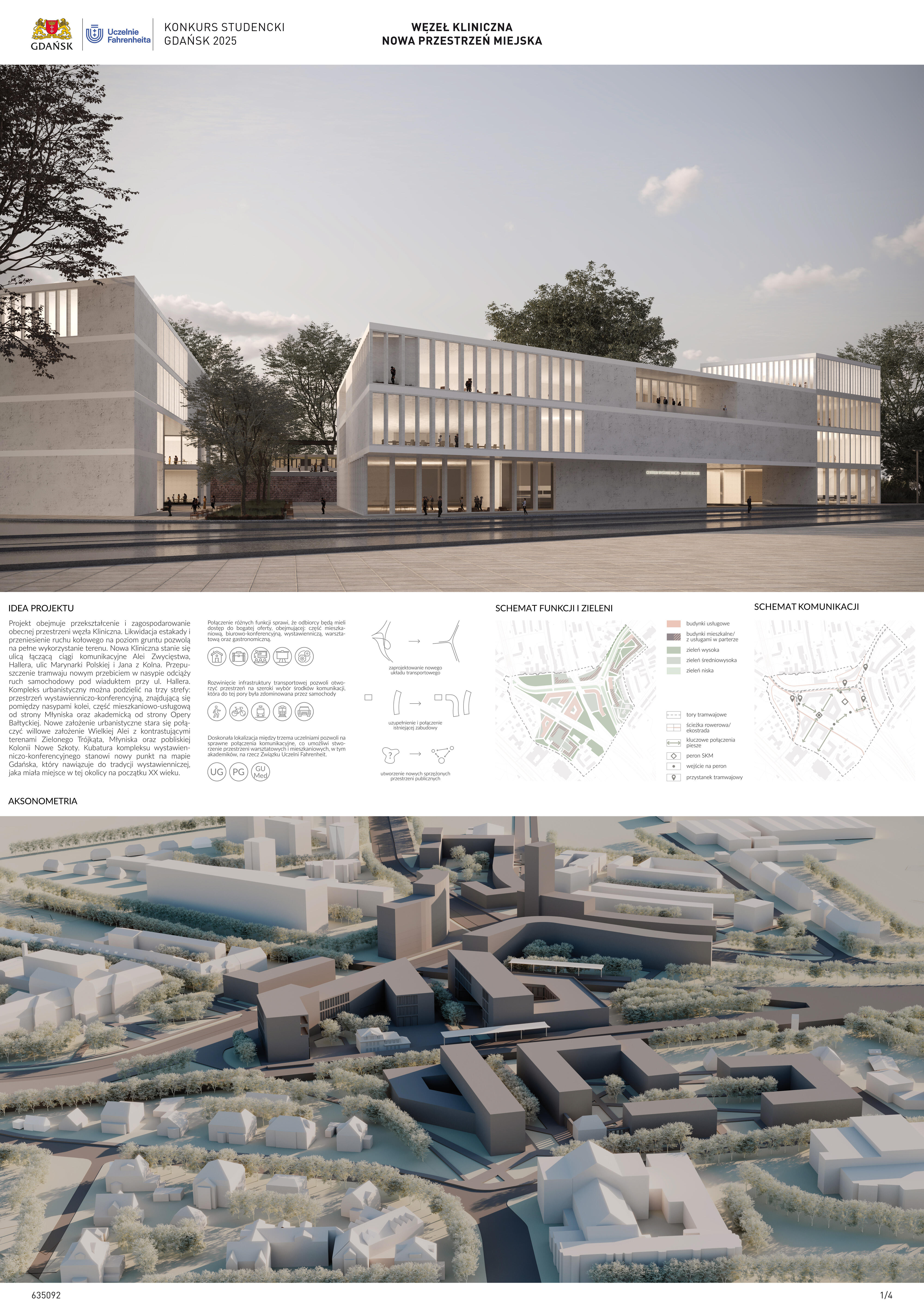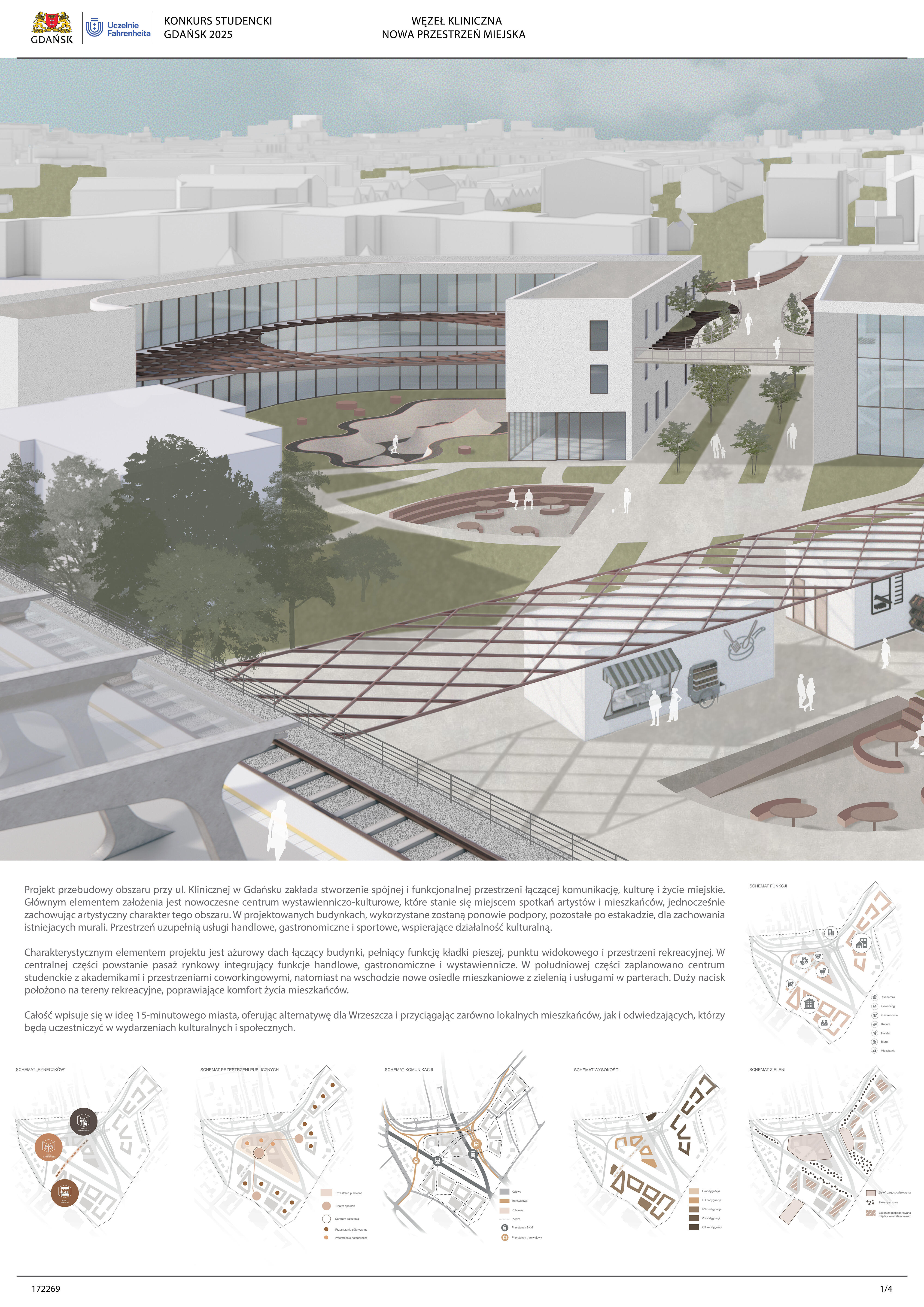 Nagrodzona praca jest spójną, konsekwentnie przeprowadzoną i czytelnie przedstawioną koncepcją realizacji nowej zabudowy w miejscu węzła komunikacji – Kliniczna. Projekt jest bardzo trafną odpowiedzią na postawione w konkursie (niezwykle trudne) zadanie polegające na połączeniu ze sobą struktur miejskich o zróżnicowanej historii, funkcji i skali. Przedstawione w konkursie rozwiązanie tworzy zwartą, miejską, wielofunkcyjną zabudowę. Projekt wyróżnia racjonalne gospodarowanie przestrzenią miasta, tworzenie atrakcyjnych przestrzennie ciągów zabudowy wzdłuż ulic i miejskich placów. Koncepcja umożliwia etapowe połączenie miejskiej struktury Wrzeszcza z terenami stoczniowymi. Zakres przekształceń funkcjonalnych i strukturalnych opracowania został właściwie poszerzony o zabudowę w kierunku Alei Zwycięstwa.