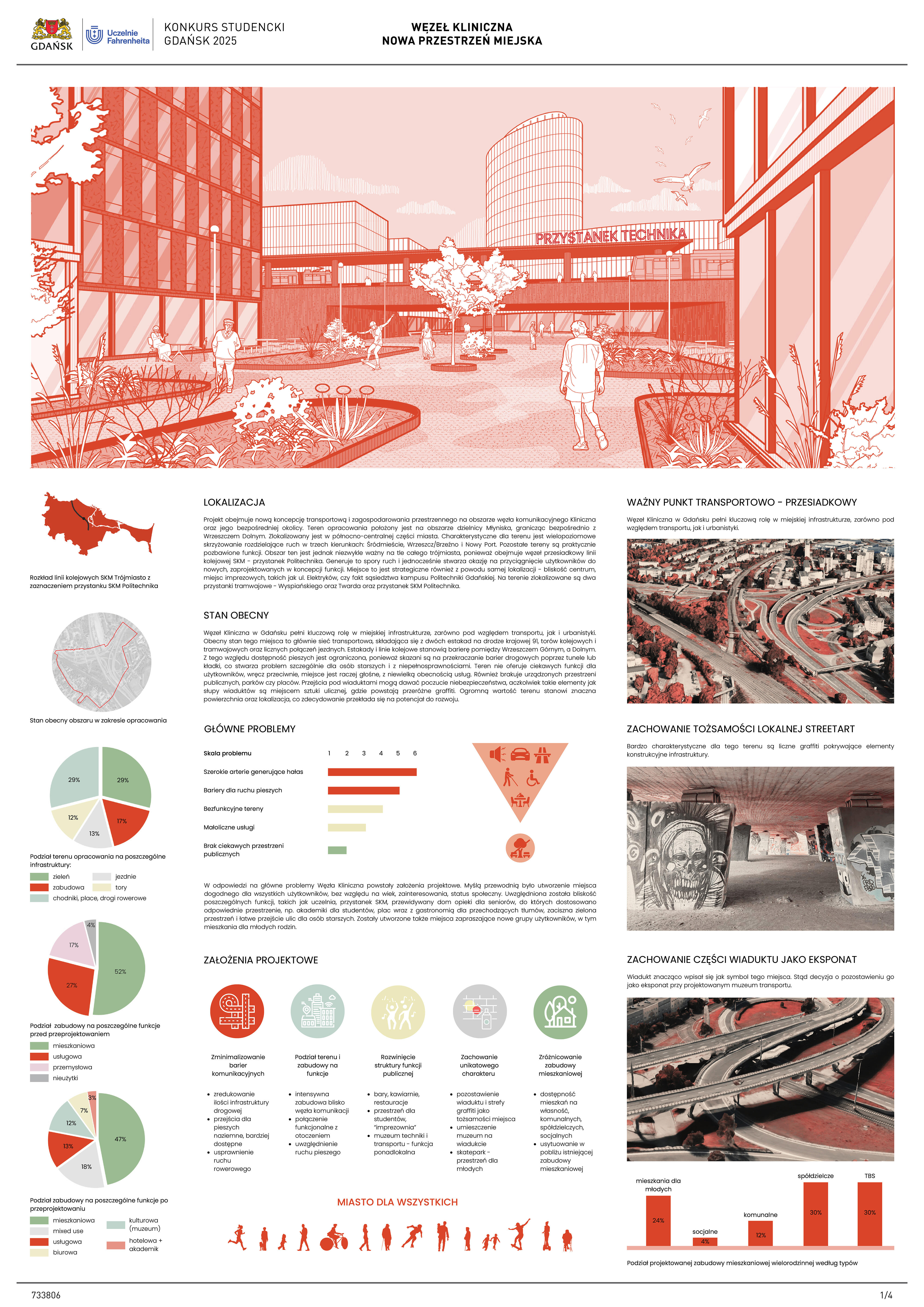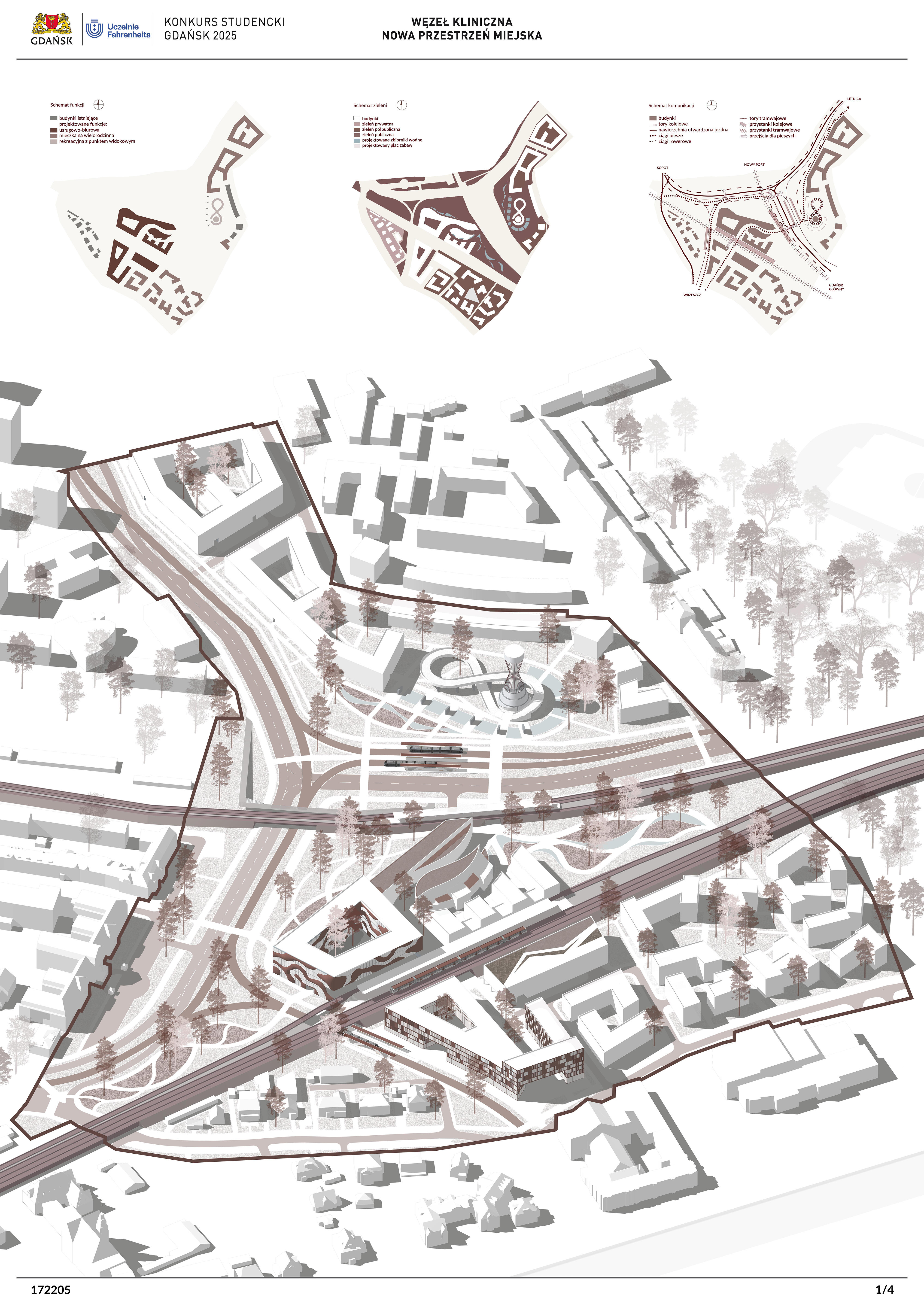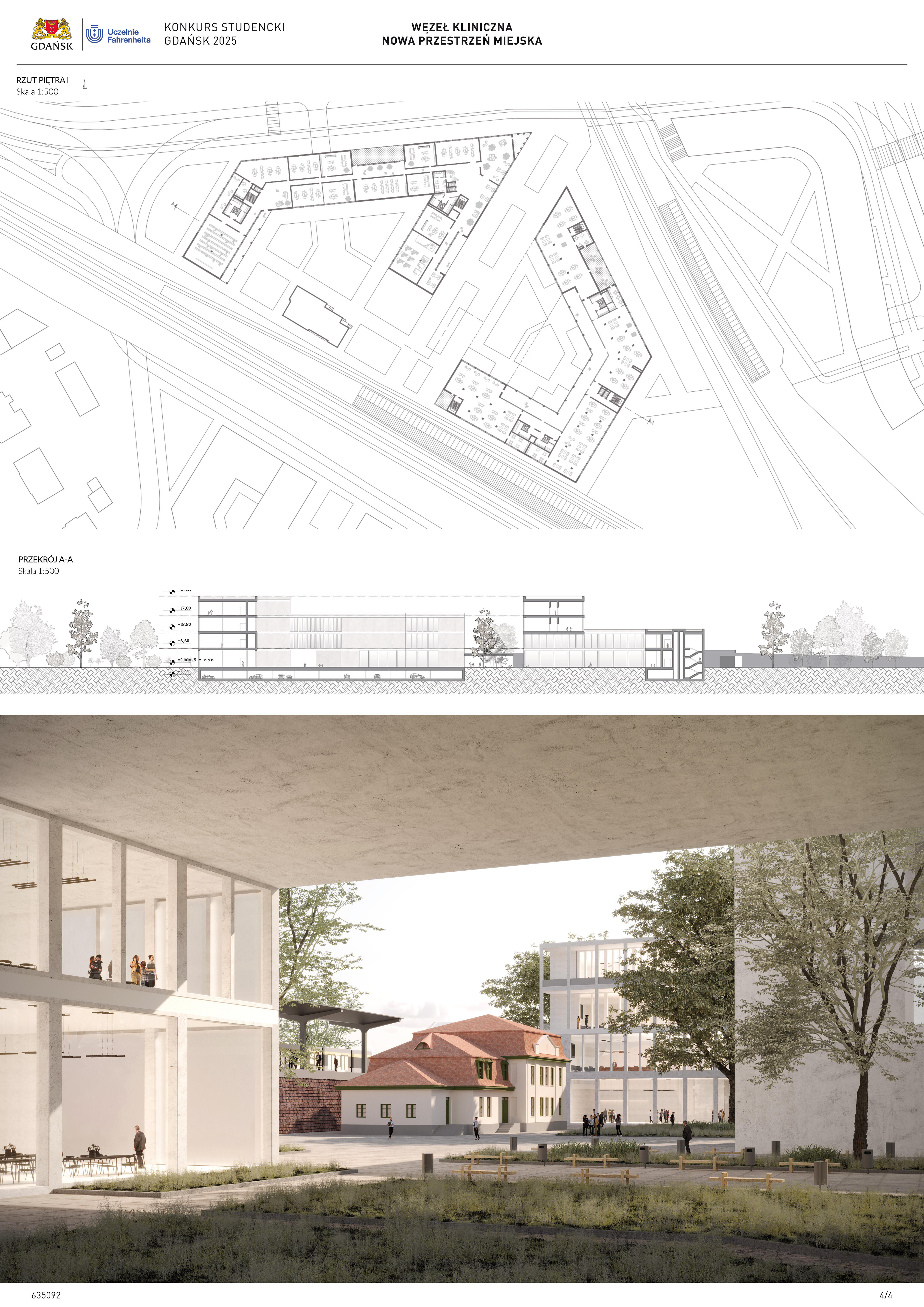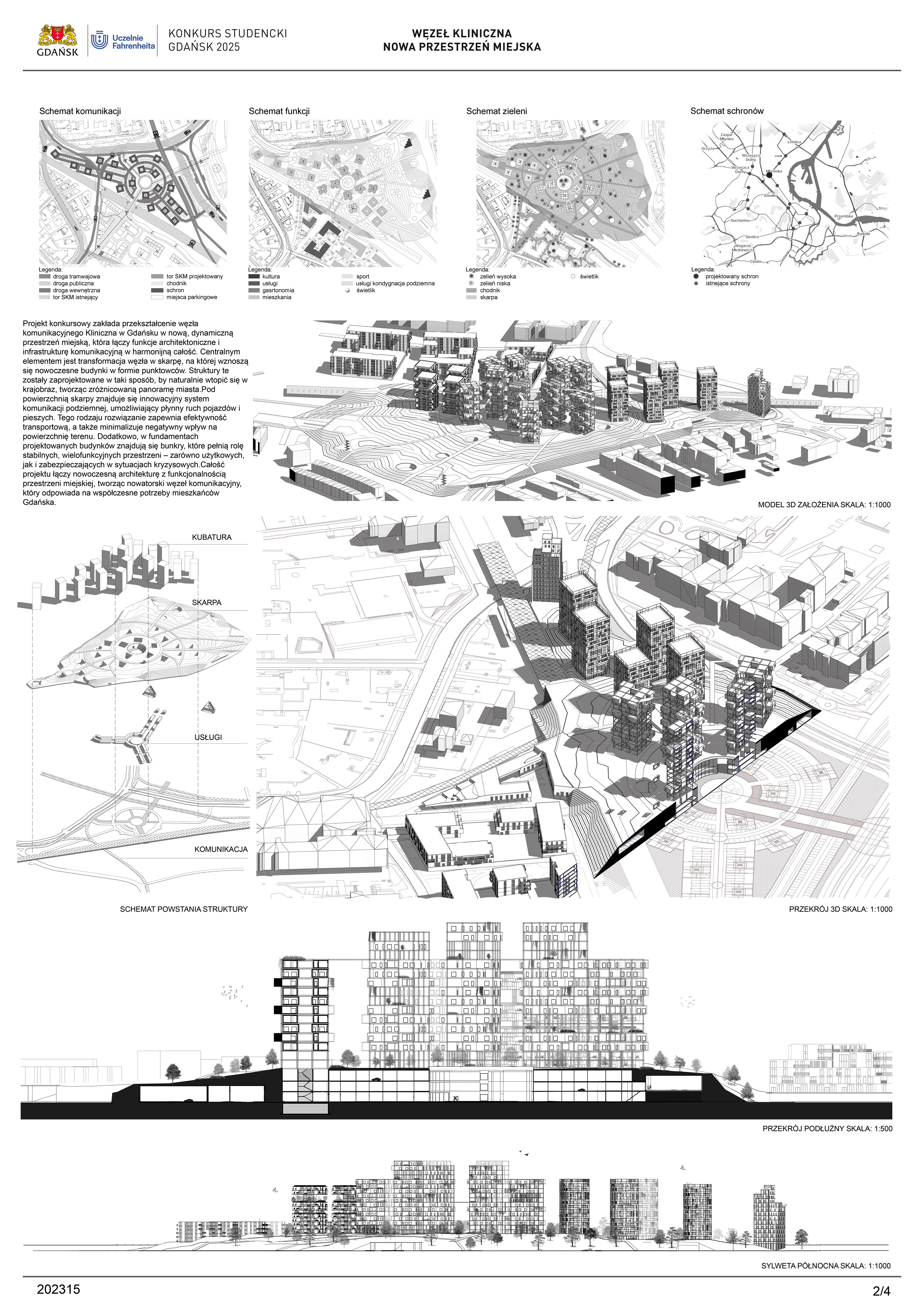 Nagrodzona praca jest spójną, konsekwentnie przeprowadzoną i czytelnie przedstawioną koncepcją realizacji nowej zabudowy w miejscu węzła komunikacji – Kliniczna. Projekt jest bardzo trafną odpowiedzią na postawione w konkursie (niezwykle trudne) zadanie polegające na połączeniu ze sobą struktur miejskich o zróżnicowanej historii, funkcji i skali. Przedstawione w konkursie rozwiązanie tworzy zwartą, miejską, wielofunkcyjną zabudowę. Projekt wyróżnia racjonalne gospodarowanie przestrzenią miasta, tworzenie atrakcyjnych przestrzennie ciągów zabudowy wzdłuż ulic i miejskich placów. Koncepcja umożliwia etapowe połączenie miejskiej struktury Wrzeszcza z terenami stoczniowymi. Zakres przekształceń funkcjonalnych i strukturalnych opracowania został właściwie poszerzony o zabudowę w kierunku Alei Zwycięstwa.