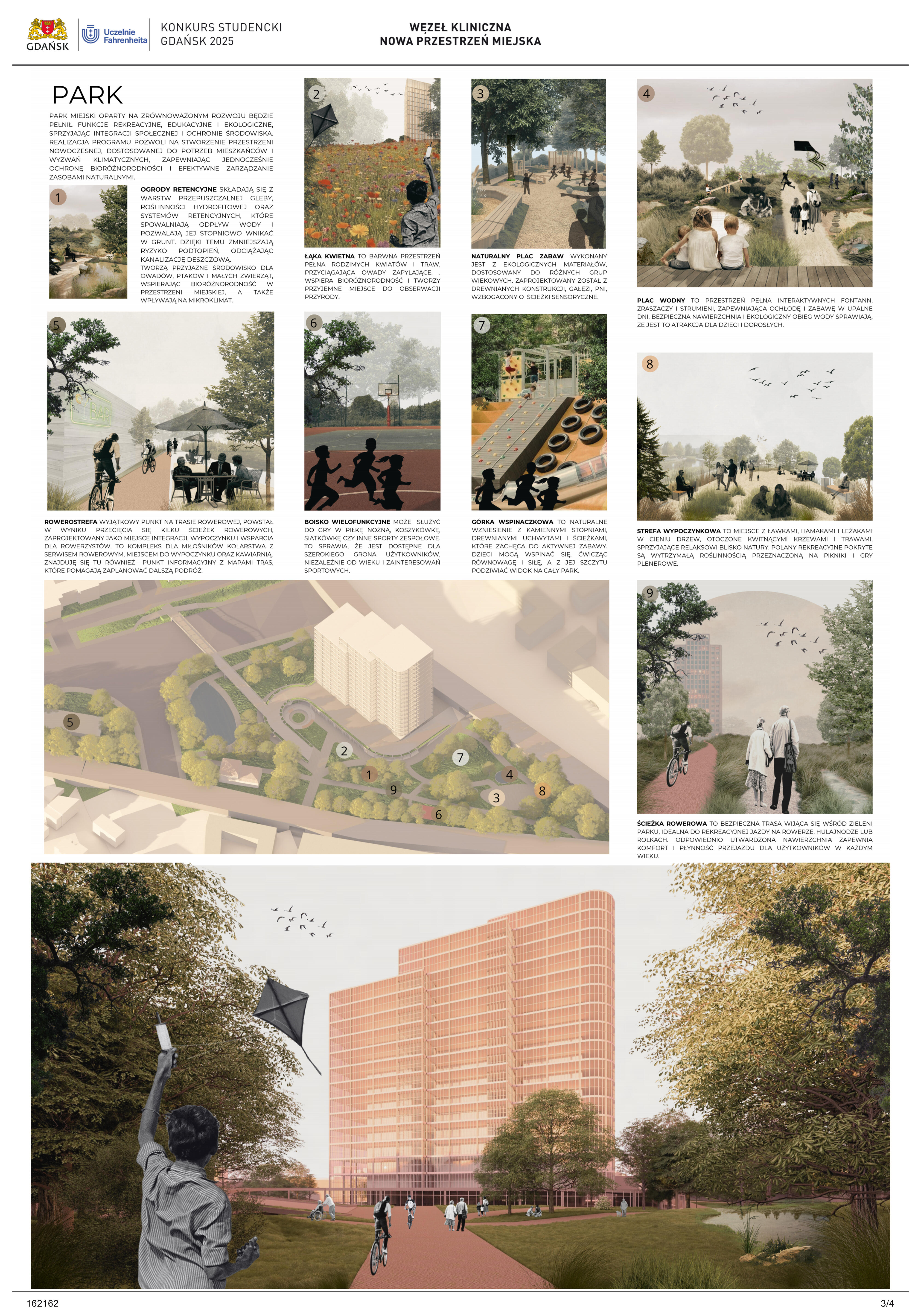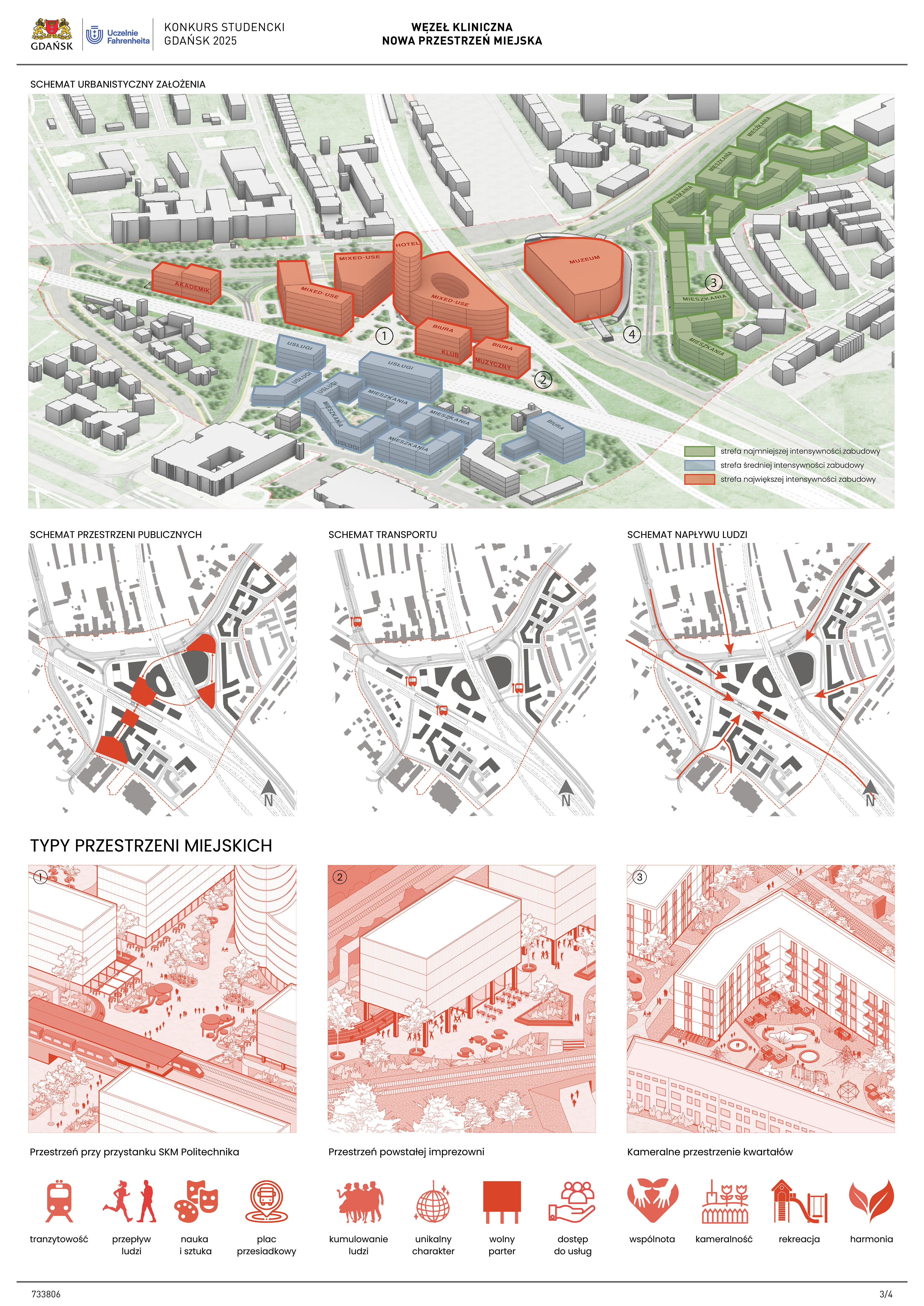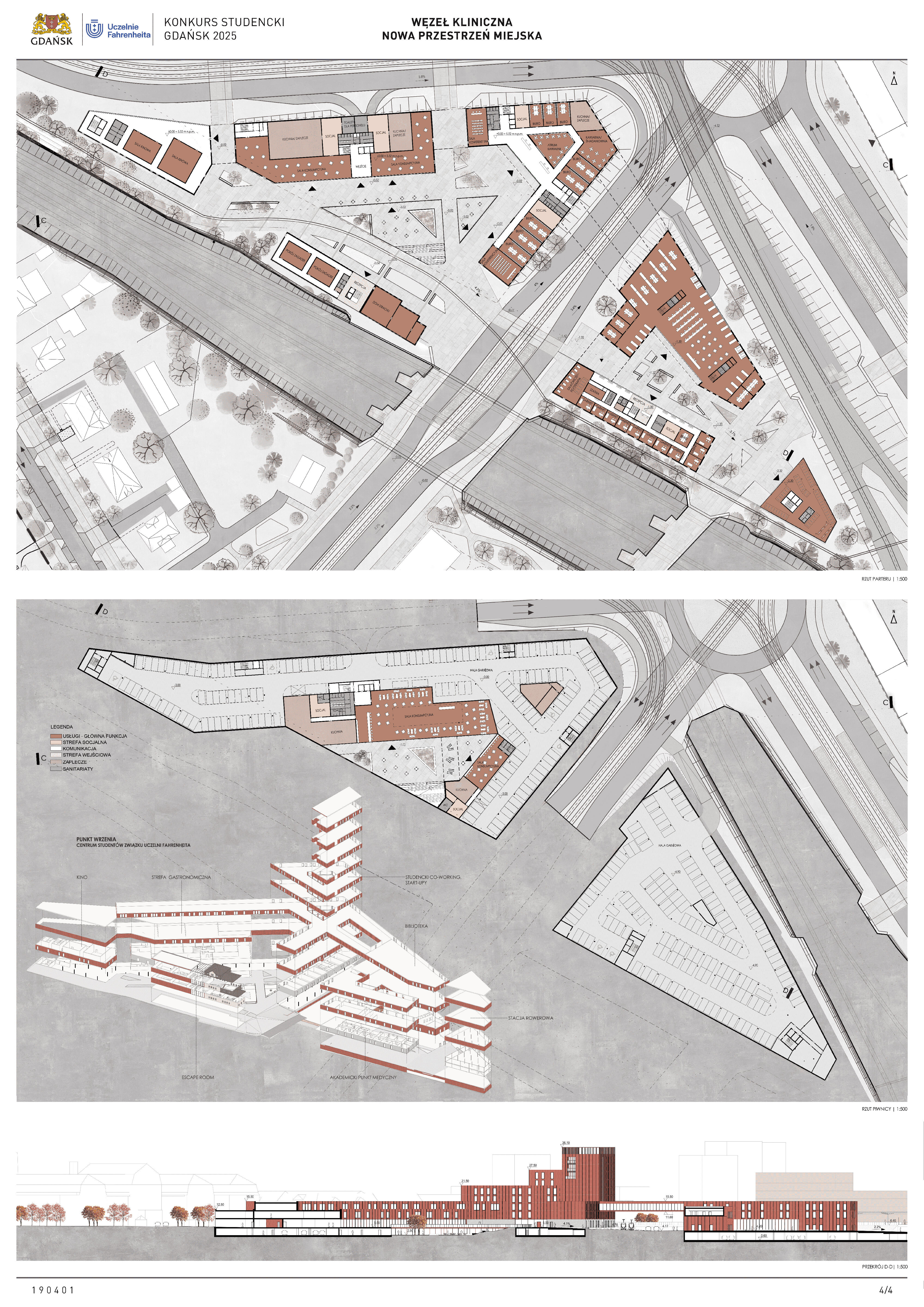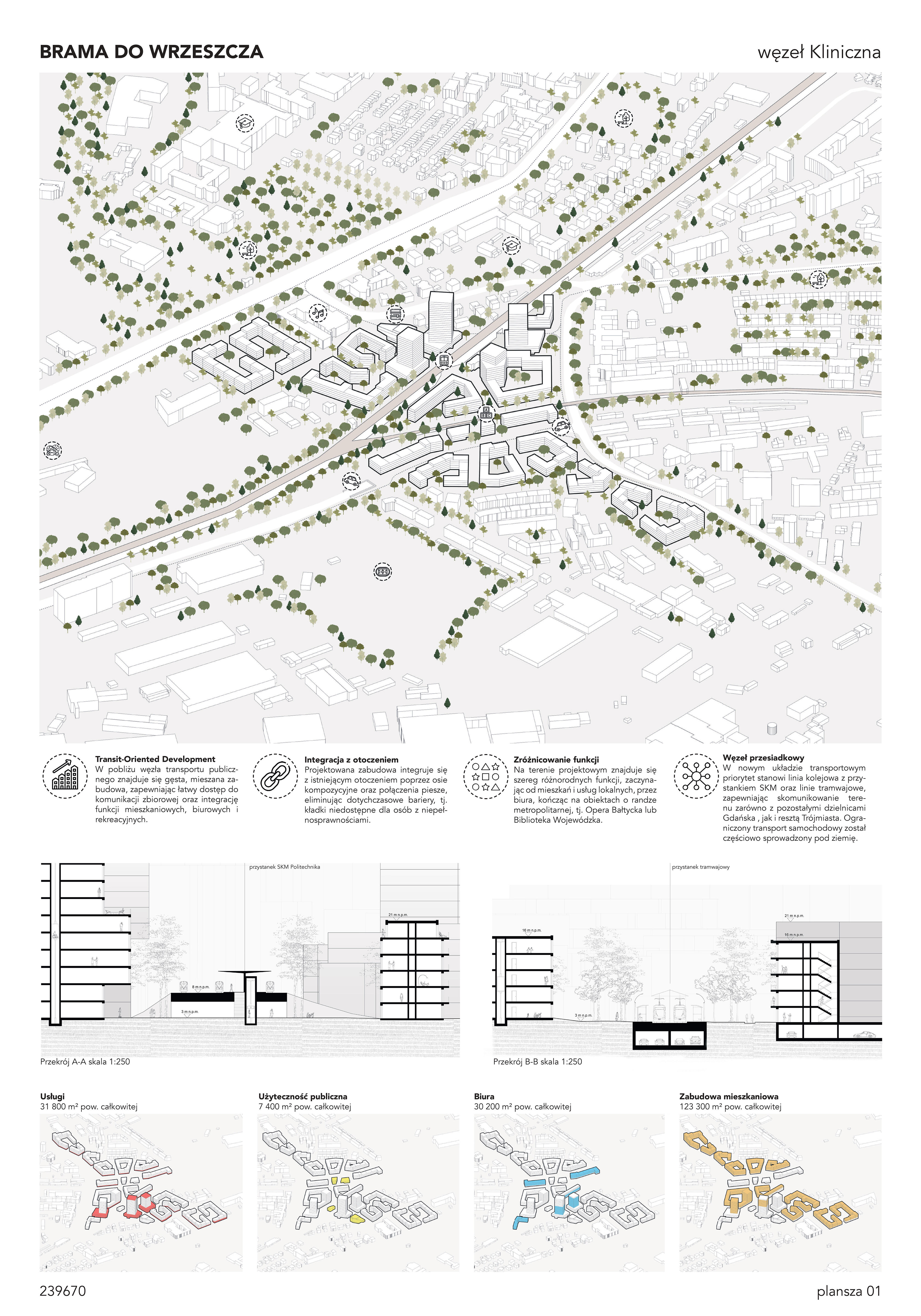 Nagrodzona praca jest spójną, konsekwentnie przeprowadzoną i czytelnie przedstawioną koncepcją realizacji nowej zabudowy w miejscu węzła komunikacji – Kliniczna. Projekt jest bardzo trafną odpowiedzią na postawione w konkursie (niezwykle trudne) zadanie polegające na połączeniu ze sobą struktur miejskich o zróżnicowanej historii, funkcji i skali. Przedstawione w konkursie rozwiązanie tworzy zwartą, miejską, wielofunkcyjną zabudowę. Projekt wyróżnia racjonalne gospodarowanie przestrzenią miasta, tworzenie atrakcyjnych przestrzennie ciągów zabudowy wzdłuż ulic i miejskich placów. Koncepcja umożliwia etapowe połączenie miejskiej struktury Wrzeszcza z terenami stoczniowymi. Zakres przekształceń funkcjonalnych i strukturalnych opracowania został właściwie poszerzony o zabudowę w kierunku Alei Zwycięstwa.
