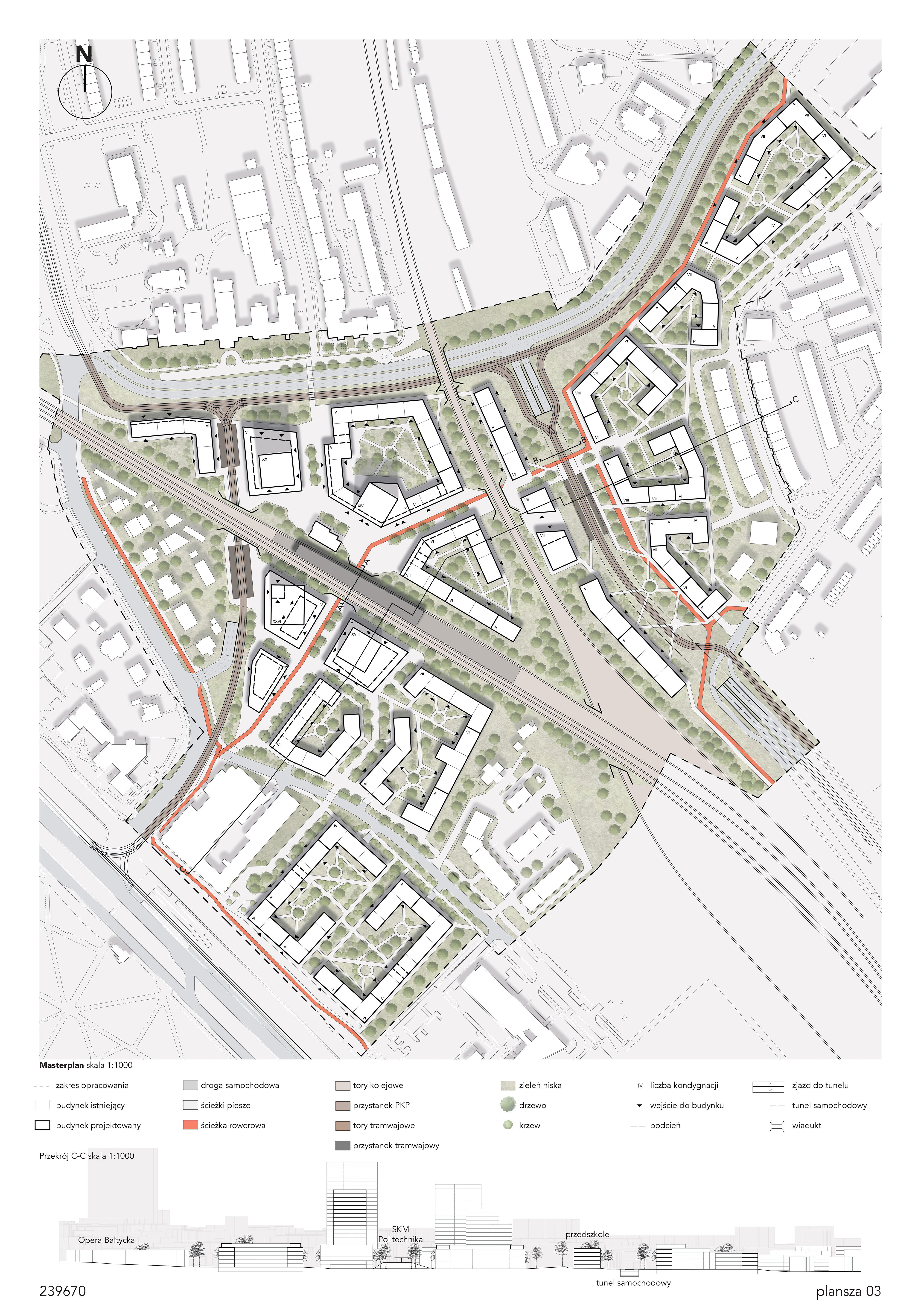 Czytelny i bezkolizyjny układ dróg i linii tramwajowych i kolejki SKM przy jednoczesnym klarownym układzie ciągów komunikacji pieszej i rowerowej tworzy bardzo zrównoważoną strukturę miejską z kulminacją zabudowy Nowego Centrum w rejonie przystanku SKM Gdańsk Politechnika. Zarówno skala jak również struktura i sposób kształtowania zabudowy pozwala na jej harmonijne wkomponowanie w istniejące otoczenie.