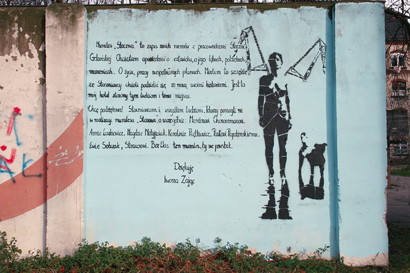 “Cielesny” mural Zając jest więc pracą intymną. Nie tylko ze względu na treść, również na miejsce ekspozycji. Znajduje się na podwórku galerii sztuki ulicznej Layup na terenie byłej Stoczni, ale niełatwo go odnaleźć (autorka na swoim FB udostępnia mapkę). Kiedy już trafimy pod odpowiedni adres, trudno dostrzec szczegóły ze względu na wysokość i zagłębienie ściany. Ale już samo poszukiwanie może być okazją do refleksji: o stoczni, której już nie ma; o ideach, które przemijają; o zawodnej ludzkiej pamięci.