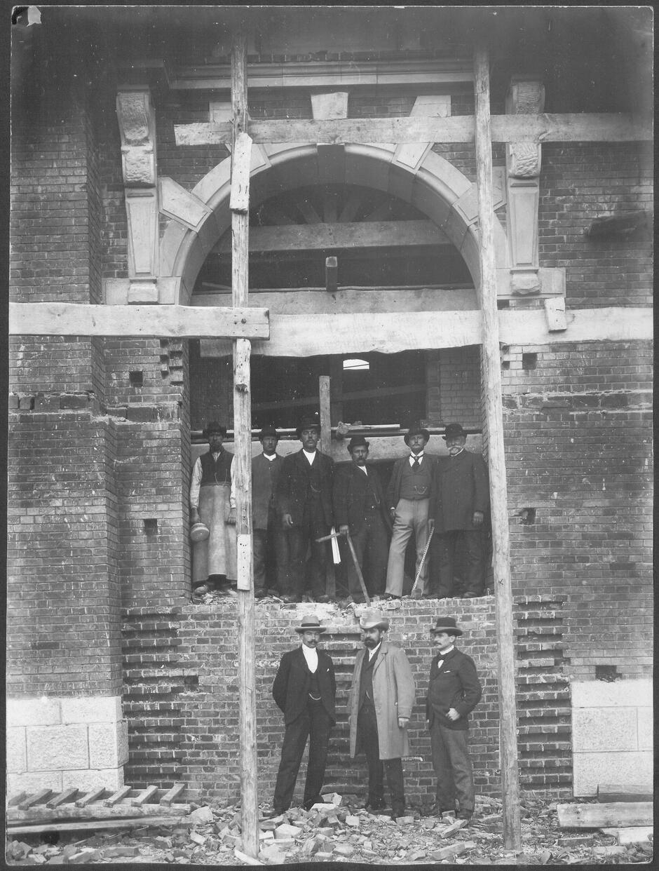 Budowniczowie na terenie powstającej nowej szkoły we Wrzeszczu, wejście główne od ul. Piramowicza, ok. 1900 r.