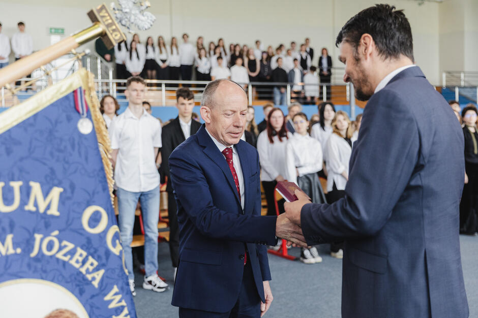 Dwaj mężczyźni, jeden drugiemu przekazuje medal w pudełku. Po lewej widać szkolny sztandar, trzymany przez poczet sztandarowy