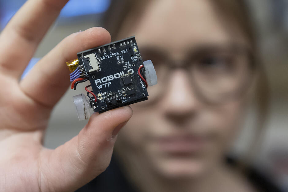 - Młodzież uczy się projektowania mechanicznego, bo sami projektują obudowy do robotów, a coraz częściej także systemy przeniesienia napędu. Poznają też techniki obróbki CNC, bo czasem korzystamy z tej technologii, by wyprodukować przednią krawędź robota sumo - wylicza Patryk Dybowski, opiekun koła, zawodowo projektant obwodów elektronicznych. - Uczą się też elektroniki, bo sami projektują, składają i uruchamiają płytki elektroniczne. I w końcu też programowania, głównie mikrokontrolerów umieszczonych na wspomnianej płytce, które decydują o tym, jak się zachowuje dany robot. Poza mikroprocesorami i silnikami w naszych robotach nie ma fabrycznych części.