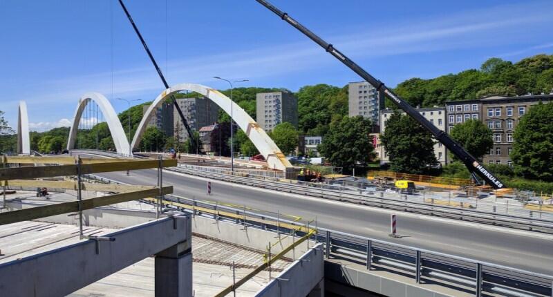 Z końcem maja zamknięto etap budowy drugiej nitki wiaduktu nad torami kolejowymi. Zakończono też montaż m.in. trzeciego, ostatniego łuku konstrukcji stalowej, zamontowano cięgna linowe i podwieszono ruszt dolny konstrukcji stalowej do łuku. Prace prowadzone są również na estakadzie dojazdowej do wiaduktu.