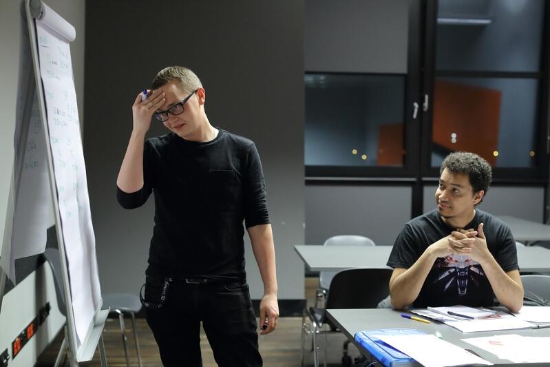 Matti Jalkanen z Finlandii rozprawia się z przyimkami statycznymi i dynamicznymi w języku polskim. Kibicuje mu Denis da Silva z Brazylii