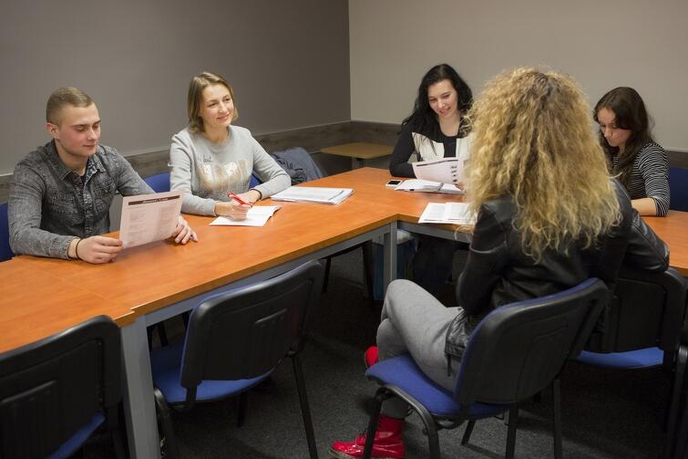 Jarek, Olga, Wiktoria, Irina i lektorka Dominika Latoch. Zajęcia w grupie najbardziej zaawansowanej z języka polskiego